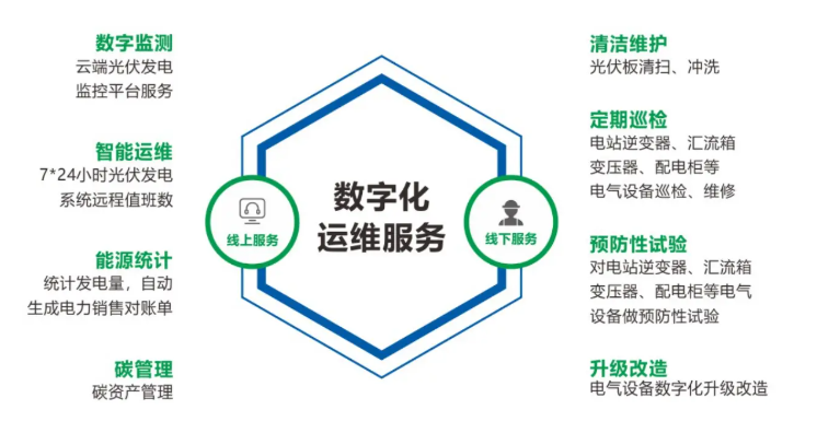 数字化运维服务包含线上服务(数据监测、智能运维、能源统计和碳管理)与线下服务(清洁维护、定期巡检、预防性试验和升级改造),提升光伏电站的运维效率和管理水平,确保系统的稳定运行和高效产出。